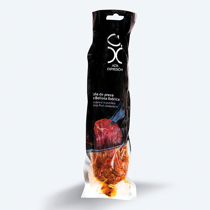 Our Alta Expresión Dry-cured Acorn-fed Ibérico Pork Underloin has a delicious flavor, with slight hints of a variety of premium quality natural spices. Its pearly, marbled fat gives it a juicy, succulent texture.
